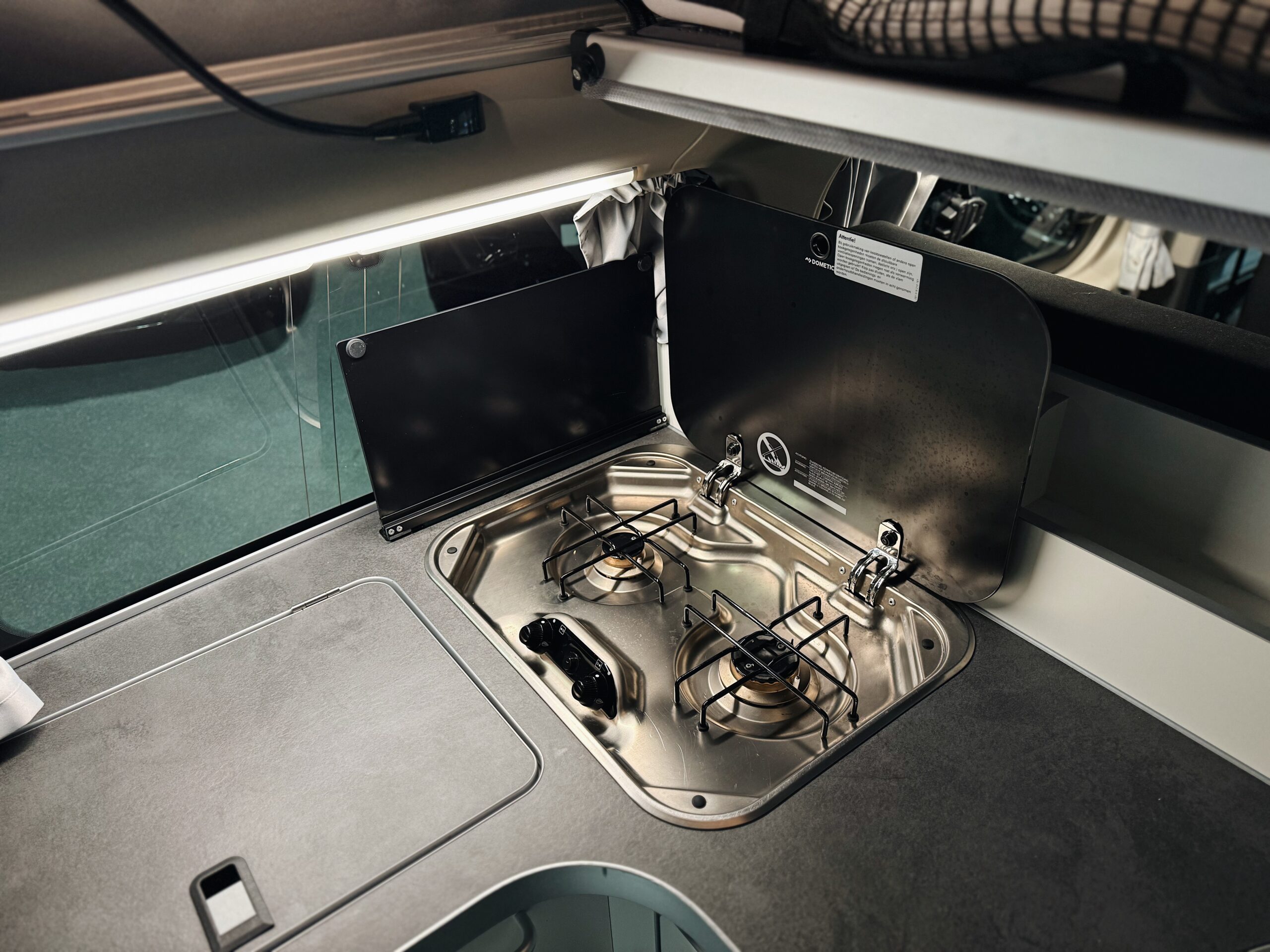 • 2-pits gaskookfornuis (Campingaz-fles geïntegreerd onder het keukenblok)